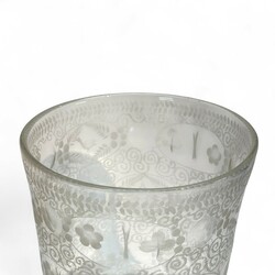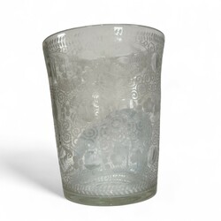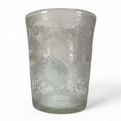 | Omschrijving | Grote glazen wijnspoeler met gegraveerd decor: dorpsgezichten, dieren en bloemen in cartouches, waaromheen krulmotieven, vermoedelijk 18e eeuw |