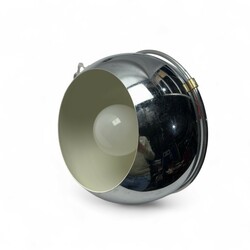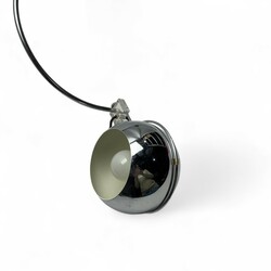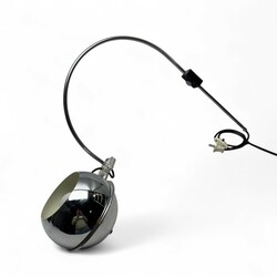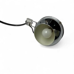 | Omschrijving | Een jaren ’60 of '70 vintage wandlamp, ontwerp gebr. Posthuma voor Gepo. Ronde. Zwarthouten wandbevestiging. Boogvormig, draaibaar en in hoogte verstelbaar, met draaibare verchroomd metalen bol, met daarachter een transparant kunststof montuur. |