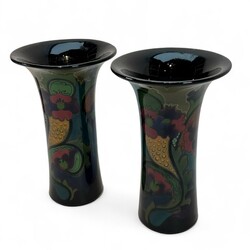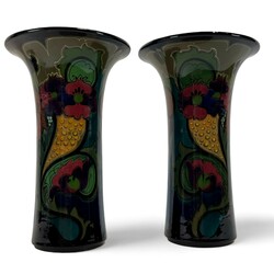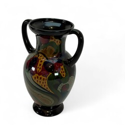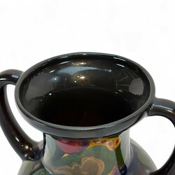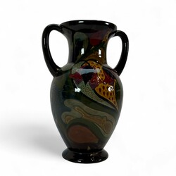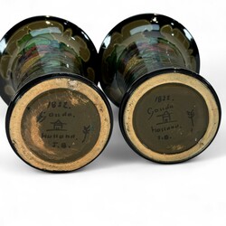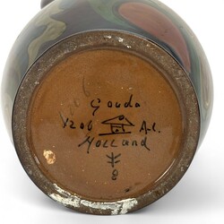 | Omschrijving | Glansplateel kaststel, bestaande uit grote oorvaas en twee bekervazen, met kleurrijke florale motieven op donker fond, gemerkt Gouda, 1920 |