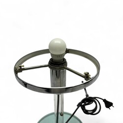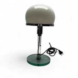| Omschrijving | Glazen tafellampje met opaline kap, staand op ronde blauw glazen voet, geïnspireerd op ontwerp Wilhelm Wagenfeld uit 1924, niet gemerkt |