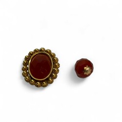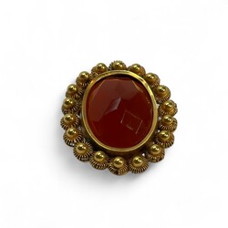 | Omschrijving | Een 20e eeuwse broche, met 14 karaats (585/1000) geelgouden rand, filigrain bewerkt, met gefacetteerde carneool. Met daarbij een ronde carneolen hanger. |