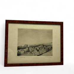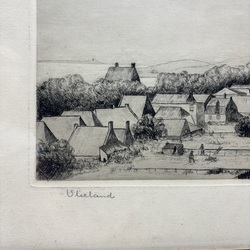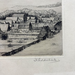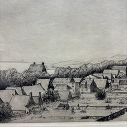 | Omschrijving | 20e eeuwse ets op papier, voorstelling van diverse huisjes met duinen op de achtergrond. Rechtsonder gesigneerd 'H. Selderbeek'. |
