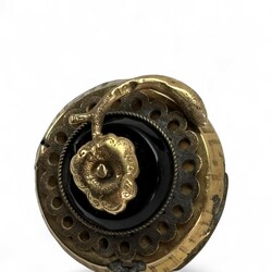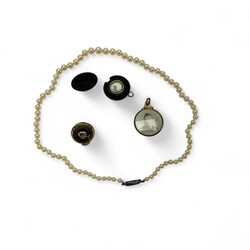| Omschrijving | Ronde vergulde hanger met portretjes, gemerkt Brevete, rond zwart rouwmedaillon met bloemdecor, parelkettinkje met tweede gehalte zilveren sluiting, en broche met geslepen onyx en gouden rand |