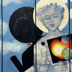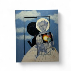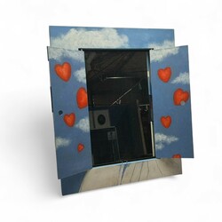 | Omschrijving | Hans Verschoor (1947), kunstobject: houten wandkastje met op de deurtjes beschilderde voorstelling van heilig figuur met aureool en haar schaduw, waarbij in een vierkant enkele planeten bij een hart afgebeeld, achter de deurtjes spiegelend oppervlak, het interieur van de deurtjes gedecoreerd met hartjes, verso gesigneerd en gedateerd '96 |
