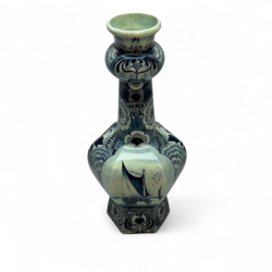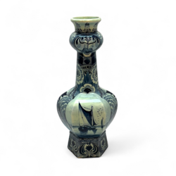 | Omschrijving | Een platelen balustervaas, 38 cm hoog. Blauw/wit met floraal decor en in een cartouch een afbeelding van twee zeilschepen. Gemerkt Delfts. Vaas van Societe Ceramique, Maastricht. Ca. 1905. Gemerkt met een B gedecoreerd door Henri Breetvelt (1864-1923). |