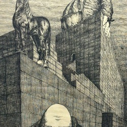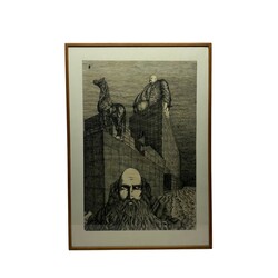 | Omschrijving | Inkttekening op papier, surrealistische voorstelling met figuren en een paard. Rechtsonder gesigneerd 'Koos' of 'Roos', gedateerd 1978. |