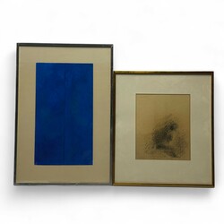 | Omschrijving | Lot van twee kunstwerken: één gemengde techniek, abstracte compositie in blauw. En een krijttekening, ongesigneerd. |