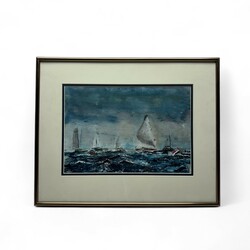 | Omschrijving | Een schilderij gemengde techniek op schilderskarton, 24 x 35 cm. Diverse schepen op zee onder Hollandse vlag/ zeilwedstrijd. Niet gesigneerd. Gelijst. |