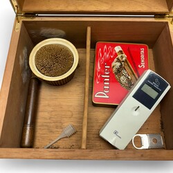 | Omschrijving | Met notenhout gefineerde humidor, 20e eeuw, daarbij: houten sigarenkoker |