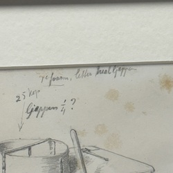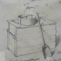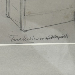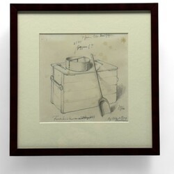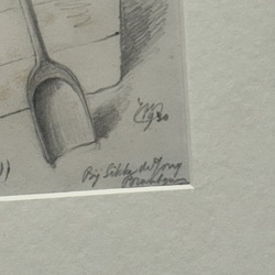 | Omschrijving | Potloodtekening op papier, voorstelling van een graanmaat, voerkist en houten schep. Rechtsonder gemonogrammeerd Ids Wiersma (Brantgum 1878 – Dokkum 1965), gedateerd 1930. Met opschrift ‘Bij Sikke de Jong Brantgum’. |