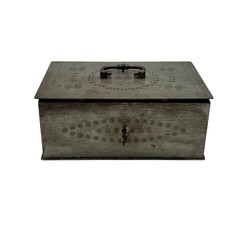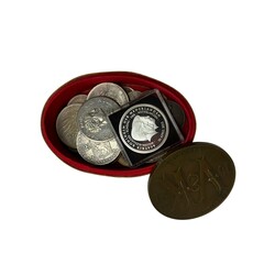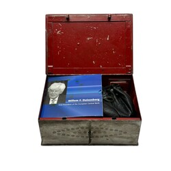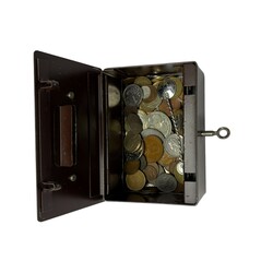 | Omschrijving | IJzeren geldkist, interieur met verzameling muntgeld, waaronder: koninkrijksmunt ten tijde van Lodewijk Napoleon, 1808, en promotiemap euromunten set van de Europese Centrale Bank, verder enkele penningen, waaronder: penning uitgegeven naar aanleiding van de opname van de Utrechtse bank Vlaer & Kol in de AMRO bank, 1977, verder: klein bruin geldkistje, lederen portemonneetje en buideltje |