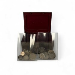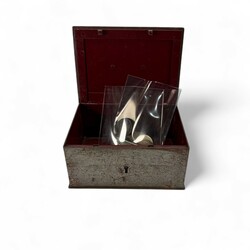 | Omschrijving | Ijzeren kistje -zonder sleutel-, met daarin verzameling munten: vier zilveren Rijksdaalders (2x 1930, 2x 1933), drie zilveren herdenkingsmunten van tien gulden (Nederland herrijst 1945-1970), tweemaal Koning Willem II (1848), éénmaal Koning Willem III (1852), en herdenkingspenning 25-jarig huwelijk Bernard en Juliana |