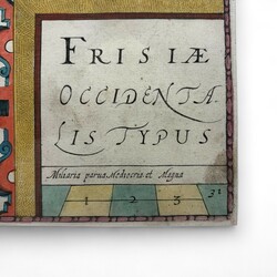 | Omschrijving | Een antieke vroeg 17e eeuwse ingekleurde kaart, Friesland. Kopergravure, afkomstig uit ‘Lodovico Guicciardini, Descrittione di tutti i Paesi bassi (…)’, ca. 1612. |