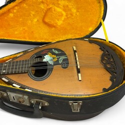 | Omschrijving | Een Italiaanse achtsnaars houten mandoline. Met floraal parelmoer ingelegd decor. In een originele koffer. jaren 50/60. |
