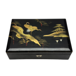 | Omschrijving | Gelakt zwart Japans sieradenkistje met goudkleurig decor van kraanvogels in waterlandschap, interieur gevuld met bijouterieën |
