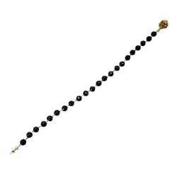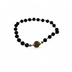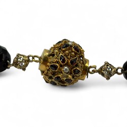 | Omschrijving | Ketting met 22 gefacetteerde granaten kralen, bevestigd door onedele oogjes, aan een opengewerkt 14 karaats gouden bolslot bezet met zaadpareltjes en kleine granaatjes |