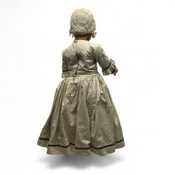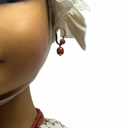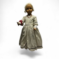 | Omschrijving | Een kinder etalagepop in jurk en met mutsje. Met een bloedkoralen halssnoer, armband en twee oorhangers. snoer en armband aan 14 krt (585/1000) gouden slot. |