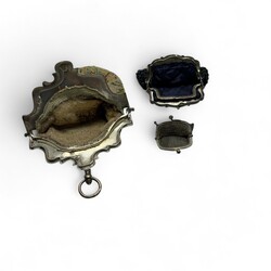 | Omschrijving | Veelkleurig kralentasje met bloemdecor en tweede gehalte zilveren heft, donkerblauw kralenbeursje met tweede gehalte zilveren heft, jaarletter 1864, en 3e gehalte zilveren maliën beursje met daarin twee muntjes van 10 cent (1938/1939) |