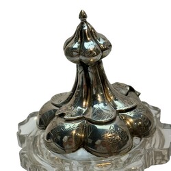 Kristallen mosterdpot op zilveren voet en met zilveren deksel