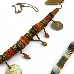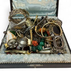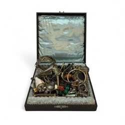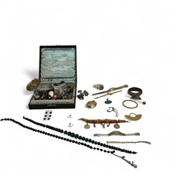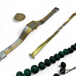 | Omschrijving | Diverse bijouterieën, waaronder: ring ingelegd met edelsteentjes, malachiet kralen ketting -sluiting defect-, schelp vermaakt tot doosje, twee damespolshorloges, etc. |