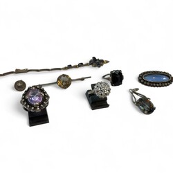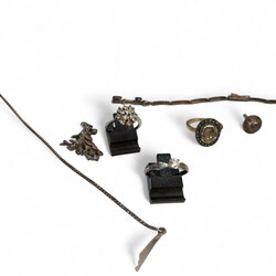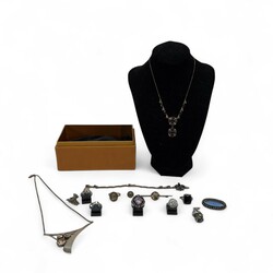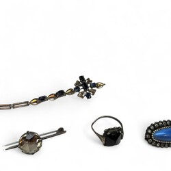 | Omschrijving | Verzameling sieraden, veelal zilver/ingelegd met diamantjes of strass steentjes, waaronder: tweede gehalte zilveren ketting met driehoekvormige hanger met drie geslepen kristallen, en twee rozetringen -één met zirkonia’s, één met diamantjes- |