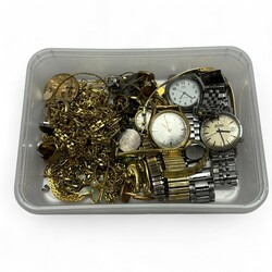 | Omschrijving | Lot bijouterieën, waaronder: twee vergulde dames polshorloges, Pontiac en Citizen Quartz, en vele goudkleurige onedele kettingen en armbanden |