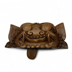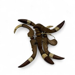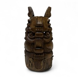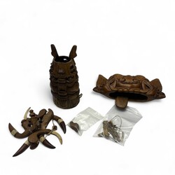 | Omschrijving | Lot gesneden houten objecten: Indonesisch masker met klepel, Afrikaans gestoken trommeltje, rondom opengewerkt met gezichtendecor, en Afrikaanse ketting met tandovrmige kralen van hout en been. |