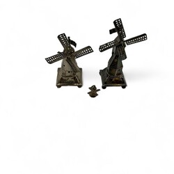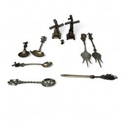 | Omschrijving | Lot klein zilveren voorwerpen met Hollandse decors, alle tweede gehalte, waaronder: paar tweede gehalte zilveren miniatuur molens, cakeprikker met landschapsdecor, meester P. Baardwijk, Schoonhoven/Nieuwpoort, werkzame periode 1926/1942, en briefopener bekroond door een schip |