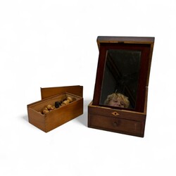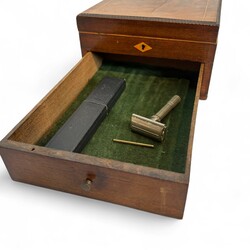 | Omschrijving | Lot kleingoed, waaronder: mahonie scheerkist met parelrand, het interieur met opklapbare spiegel, 19e eeuw, inclusief twee antieke scheermesjes, waarvan één gemerkt The Hamburg Ring, Solingen, Duitsland, verder houten schaakset, en miniatuurportretje |
