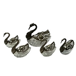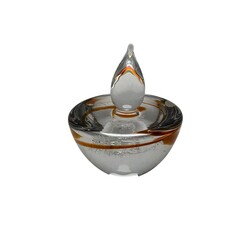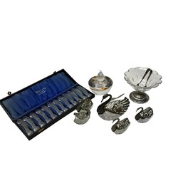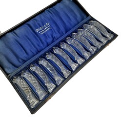 | Omschrijving | Lot kristal en glas, diverse leeftijden: serie van twaalf geslepen kristallen messenleggers in de vorm van visjes, uitvoering Wille & Co, Amsterdam, in originele doos, massief glazen vaasje met druppelvormige stop, bestickerd ‘250 jaar Douwe Egberts’, kristallen schaaltje op zilveren voet, tweede gehalte zilveren suikertang, daarbij: vijf glazen schaaltjes in de vorm van zwaantjes |