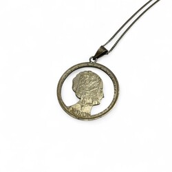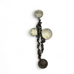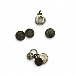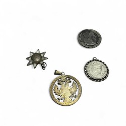 | Omschrijving | Lot met munten verwerkt tot sieraden, zoals broches, gezaagde munten vermaakt tot hangers of bedels, waaronder een armband met Duitse mark uit 1892, twee halve marken uit 1915-17, en halve Frank uit 1959, daarbij: losse zilveren 5 Frank muntstuk: aan een zijde portret van koning Leopold II, verso met opschrift ‘L’union fait la force’, uit 1869 |