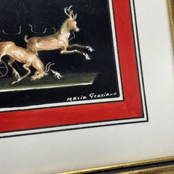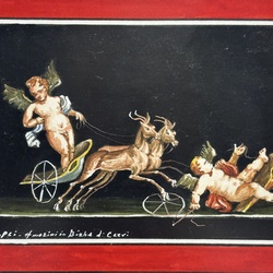 | Omschrijving | Gouache op papier, voorstelling van twee engelenwagens. Met opschrift ‘Pompei Amozini in Biele di Cezvi’. Rechtsonder gesigneerd Maria Graziano. |
