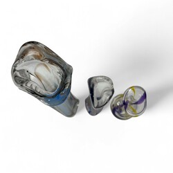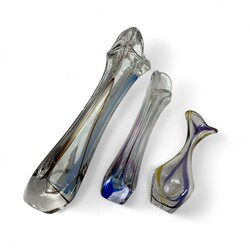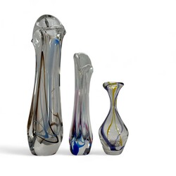 | Omschrijving | Drie kristallen vazen uit de Kristalunie collectie, 37, 27 en 19 cm hoog. Blankglas met gekleurde banen. Ontwerp Max Verboeket (1922-2015) voor de Kristalunie, Maastricht. |