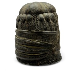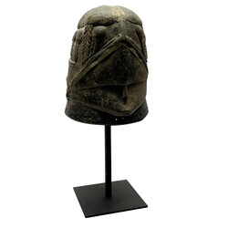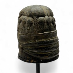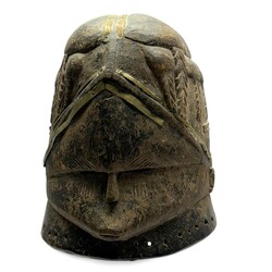 | Omschrijving | Een 20e eeuws uit hout gestoken Afrikaans helmmasker, ingelegd met metalen banden. Mende-bevolking, Sande, Sierra Leone. |