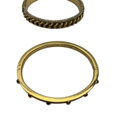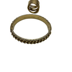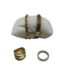 | Omschrijving | Twee vergulde armbanden gezet met glassteentjes, en vergulde stapelring, alle drie gemerkt Michael Kors, daarbij: stalen ring, gemerkt Pequignet |