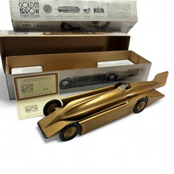| Omschrijving | Goudkleurig blikken model raceauto: ‘Golden Arrow Land Speed Record Car’, uit de Schylling Collectors Series, inclusief certificaat, in originele verpakkingsdoos |