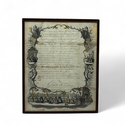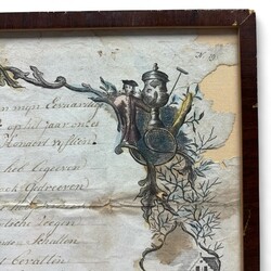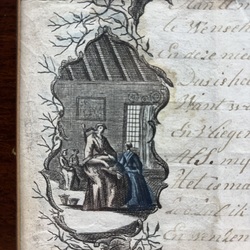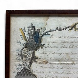 | Omschrijving | Een vroeg 19e eeuwse nieuwjaars wens, 40 x 33 cm. Handgeschreven op een voorgedrukt en ingekleurde pagina. Gesig. Gepke A. Dijkema 1815. |