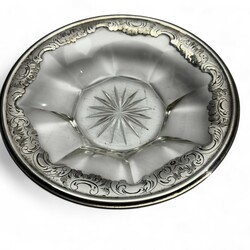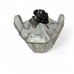 | Omschrijving | Paar achtkantige geslepen kristallen dekselpotten met tweede gehalte zilveren dekselknop in de vorm van een roos, op bijbehorende onderschotels met tweede gehalte zilveren monturen, onduidelijk meesterteken, jaarletter 1854 |