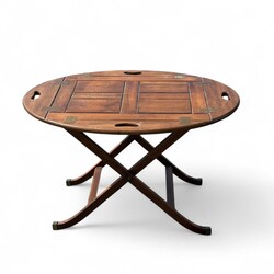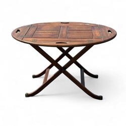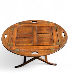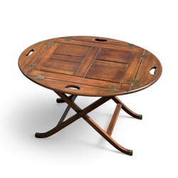 | Omschrijving | Paar ovale mahonie klaptafeltjes met messing beslag, waarvan de randen van het blad zijn in te klappen tot een serveerblad met grepen, tweede helft 20e eeuw |