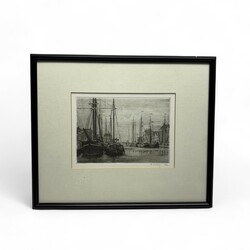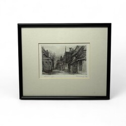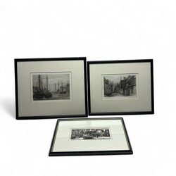 | Omschrijving | Pieter Oving (1923-2004), twee etsen: dorpsstraatje en schepen in de haven, beide rechtsonder gesigneerd in potlood, en houtsnede: wandelend figuur in dorpje met brug, rechtsonder gesigneerd in potlood |