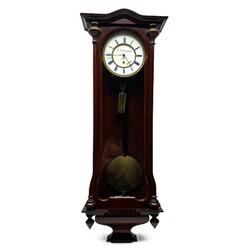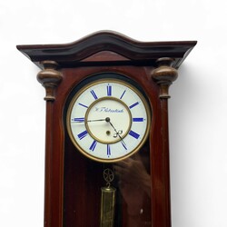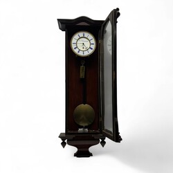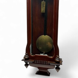 | Omschrijving | Regulateur in bruingelakte houten kast, de geëmailleerde wijzerplaat met adres H.F. Rebentisch, Duitsland/Oostenrijk, eind 19e/20e eeuw |