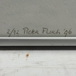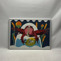| Omschrijving | Kleuren zeefdruk op papier 1/12, 50 x 70 cm. Springende kikvors met wesp. Gesigneerd Reka Flach |
