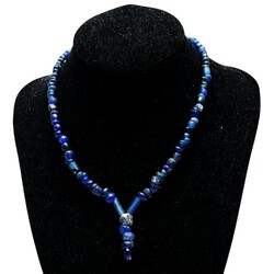 | Omschrijving | Een antieke (opnieuw geregen) Romeinse ketting, bestaande uit ronde glazen kralen in verschillende vormen en tinten blauw, met een hangerachtige druppel gevormd door enkele kralen verticaal en twee langwerpige kralen. Met zilveren slotje. |