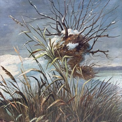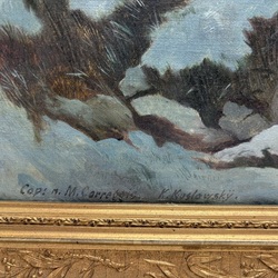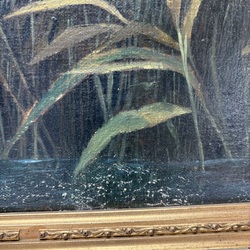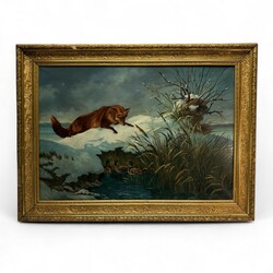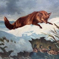 | Omschrijving | Schilderij: vos jaagt op eendjes, olieverf op doek, rechtsonder gesigneerd K. Koslowsky, kopie naar M. Correggio |