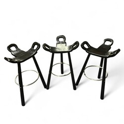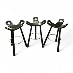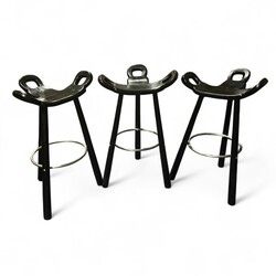 | Omschrijving | Lot van drie 20e eeuwse zwartgelakte houten barkrukkenl, Spaanse stijl. Mogelijk model ‘Marbella’, ontwerp Sergio Rodriquez voor Conoform, ca. 1970. |