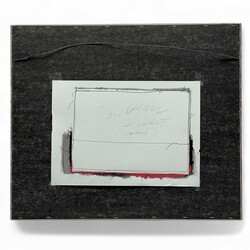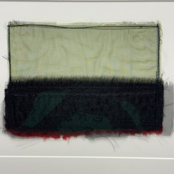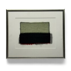 | Omschrijving | Textielcollage met grijs en zwart-rood lapje. Titel ‘Doerebout’, verso gesigneerd Sies Bleeker (Heerenveen 1941-2014). |