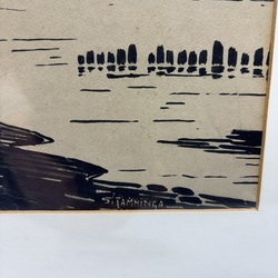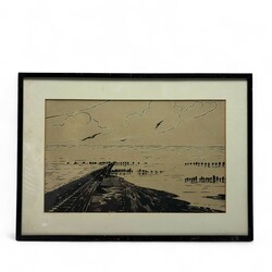 | Omschrijving | Inkttekening op papier, voorstelling van de Waddenzee onder St. Jacob Parochie, ca. 1930. Linksonder gesigneerd Simon Kamminga (Harlingen 1895 - Leeuwarden 1984). Verso opschrift 'Stroomleiders voor bescherming van de zeedijk, Breede stuk uitgebouwd in zee is omgeven door houten palen'. |