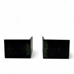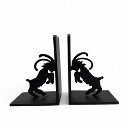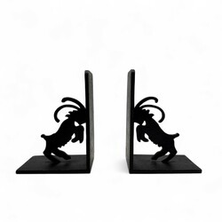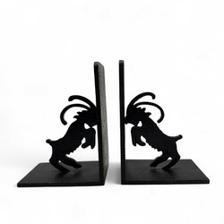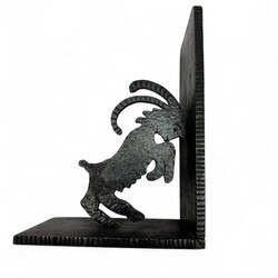 | Omschrijving | Een paar smeedijzeren en gehamerde boekensteunen, 15 cm hoog. Versierd met uitgezaagde sculpturen van steenbokken, ca 1930 |
