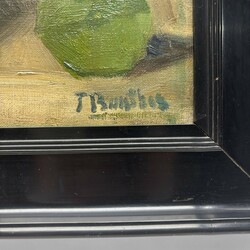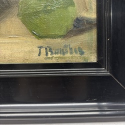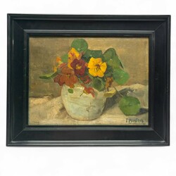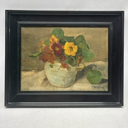 | Omschrijving | Schilderij, olieverf op doek. Stilleven met viooltjes in een gemberpot. Rechtsonder gesigneerd T. Bontkes |