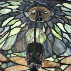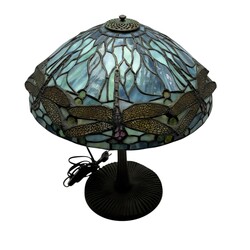 | Omschrijving | Tafellamp met bronskleurige metalen voet, de blauwe glas-in-loodkap gedecoreerd met libelles, Tiffany-stijl, modern |